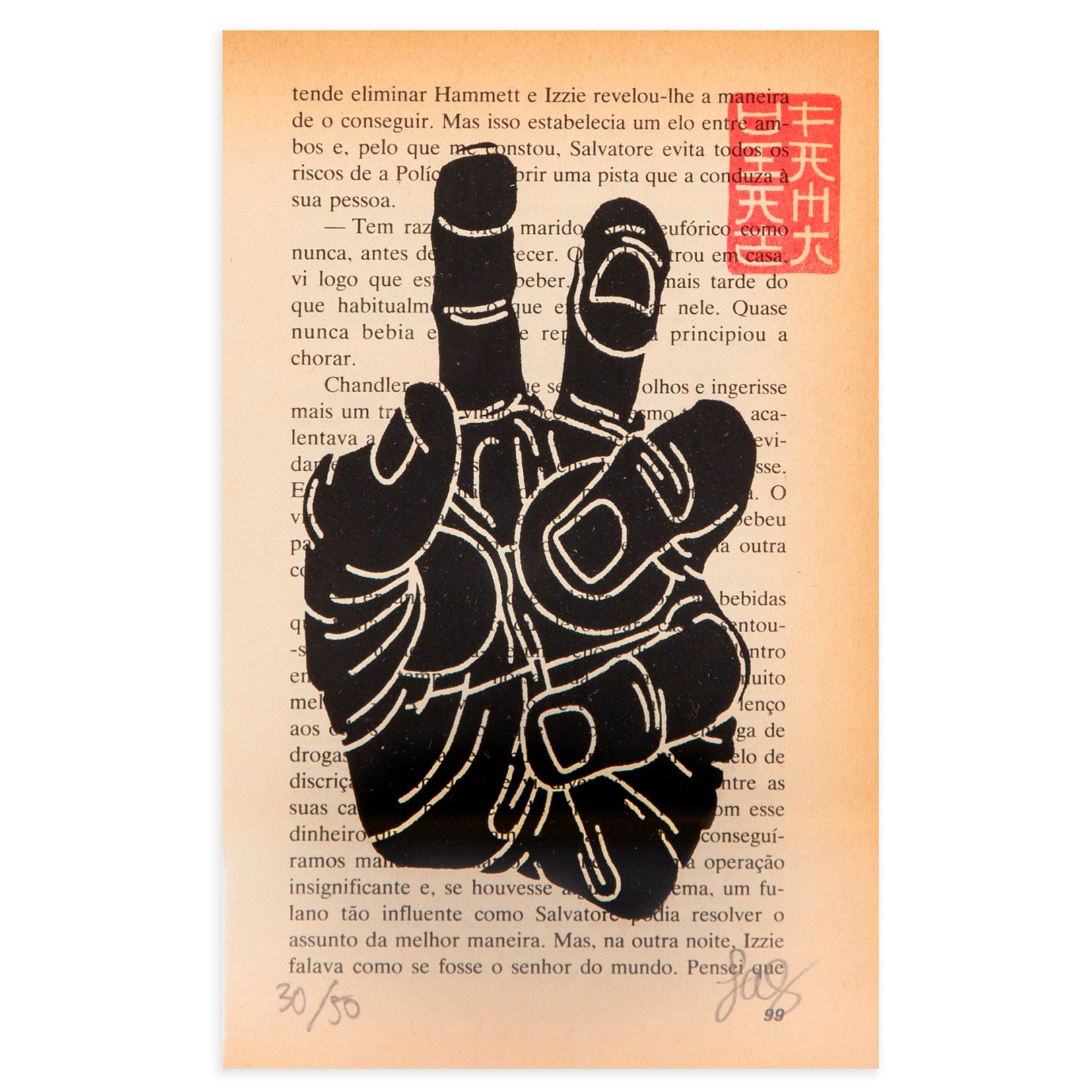 Un homenaje a la novela negra, a la literatura de Raymon Chandler, el gran escritor del género policiaco norteamericano. Esta serigrafía de edición limitada realizada a mano sobre papel envejecido, rinde tributo a esas tramas criminales con trasfondo psicológico, a sus relatos sobre la vida urbana y la corrupción que desde esas páginas nos enganchan. Raymon Chandler dejó un catálogo de títulos que aún hoy siguen vigentes: El sueño eterno (1939), Adiós, muñeca (1940), El largo adiós (1953) o La ventana siniestra (1942). Tal fue su fama a mediados del siglo XX, que el propio Alfred Hitchcock lo fichó como guionista de Extraños en un tren, basada en la novela de Patricia Highsmith. Hoy, esta obra también es una historia detectivesca, absolutamente genial y quizá no resuelta, con la mano de Juan Díaz-Faes.