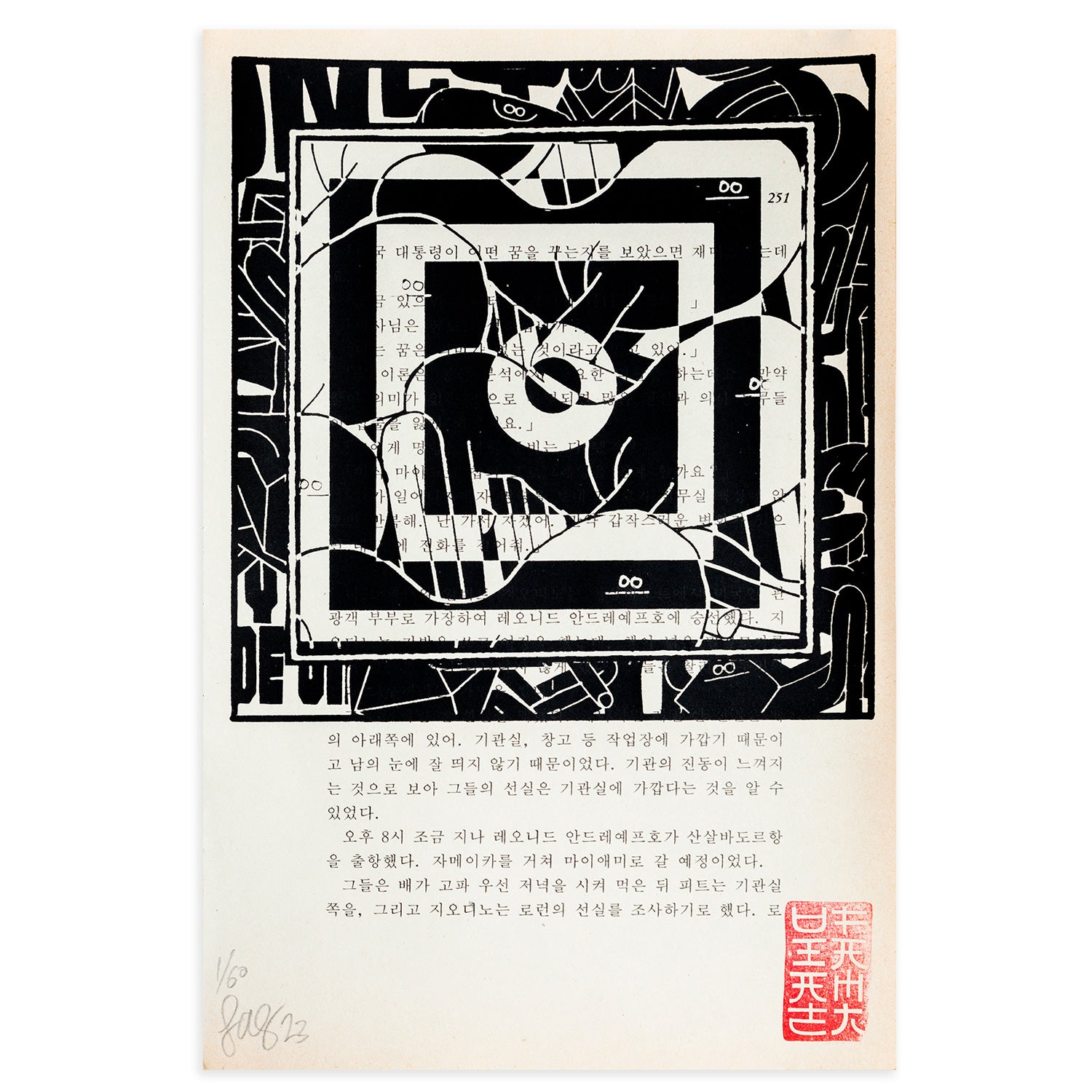 Un cuadro superpone a otro, y este a otro, y así podría ser hasta el infinito, en bucle... Porque esta serigrafía realizada a mano sobre papel envejecido del artista Juan Díaz-Faes es también una representación de la inmensidad de conceptos universales como el yin y el yang. Para ello, el creador se ha servido del libro Yeosan, centrado en la oscura temática de las drogas, y ha transformado sus páginas en un escenario positivo-negativo, simulando el punto de vista de una persona bajo el efecto de cualquier sustancia. El resultado es hipnótico, con microhistorias en cada uno de esos marcos que nos hacen navegar por el subconsciente humano, y al final, siempre puede que aparezca una salida…