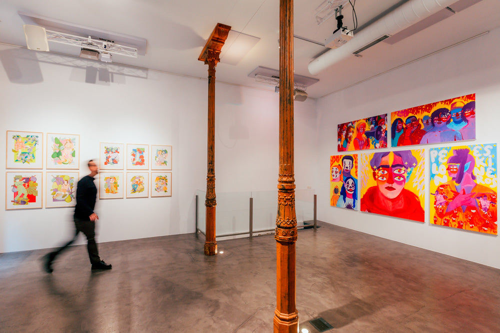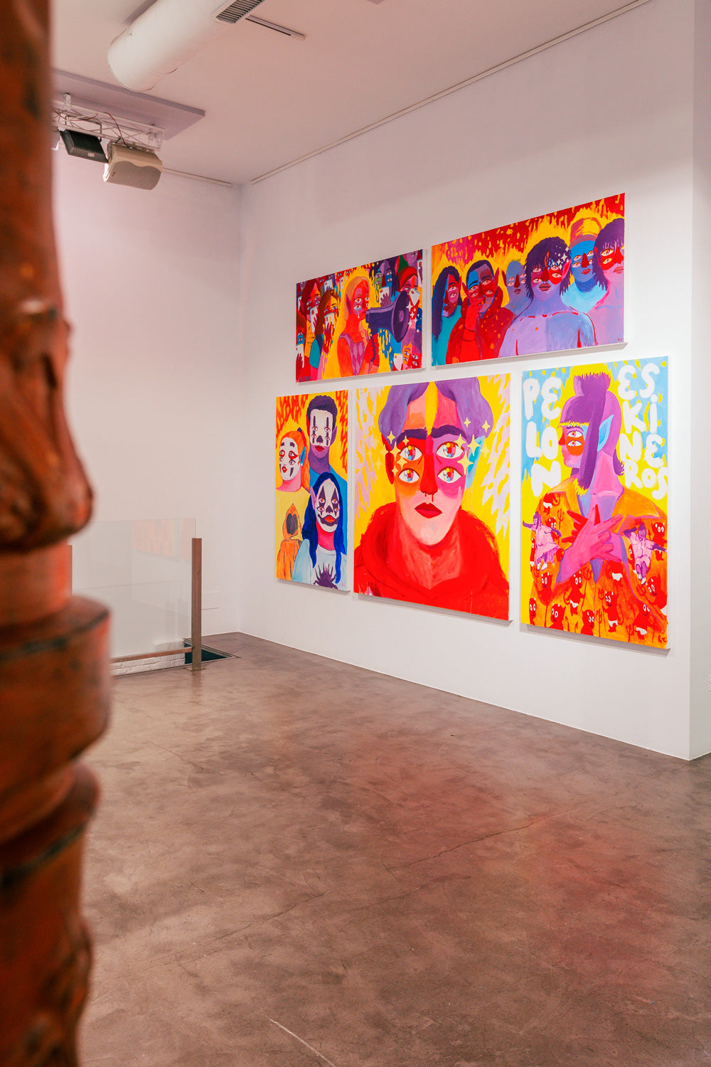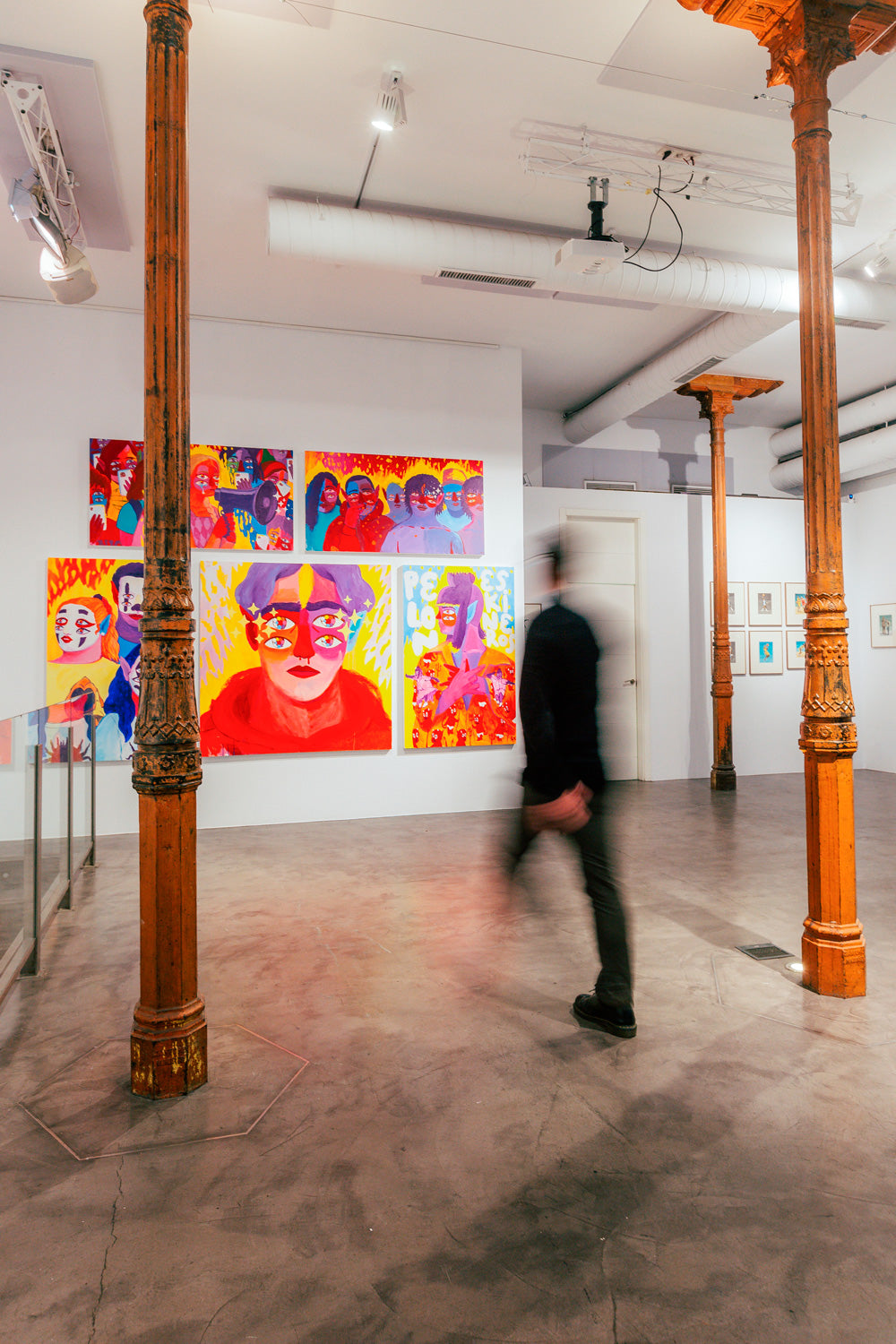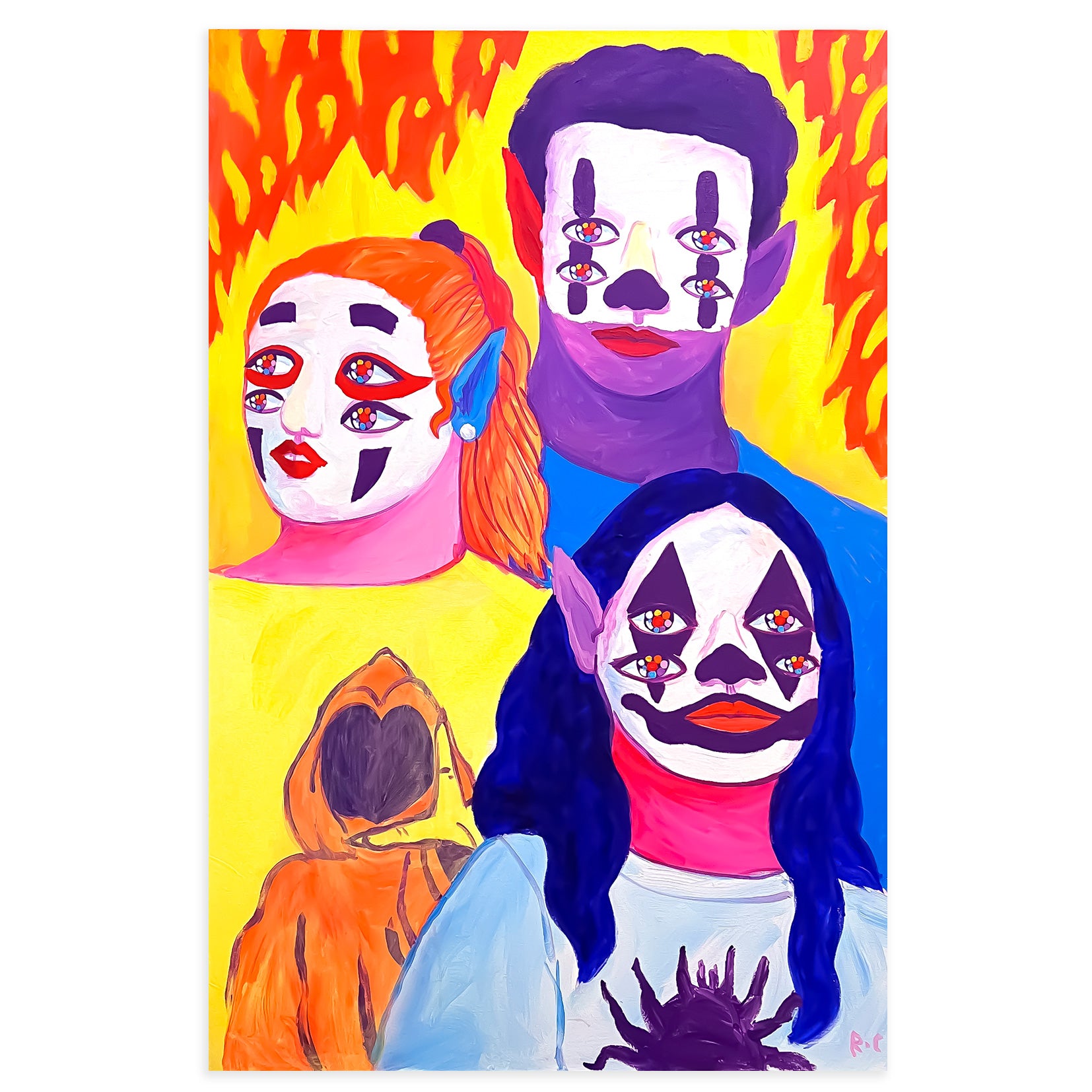 Don't be fooled. These three characters are beings illuminated by good luck, by fortune. They are circus characters who come to make our lives easier, brighter, although behind them (as you can see it in the artwork) some darkness may arise and harasses them. They will always come out victorious. This piece is part of Cavolo's 'Flame' series of large-format portraits of characters where fire appears in the background and tries, almost unsuccessfully, to reach their souls. Let nothing burn good intentions!