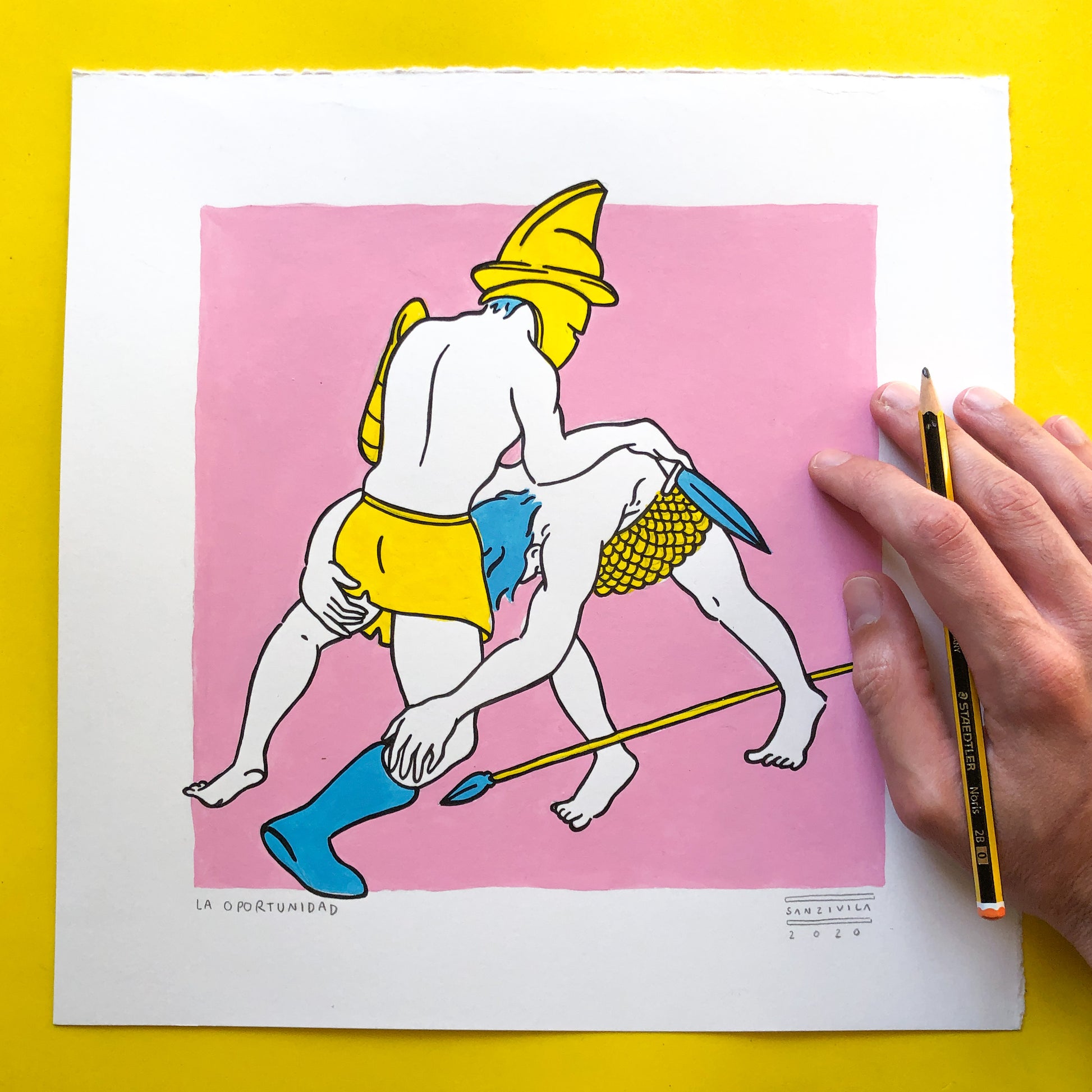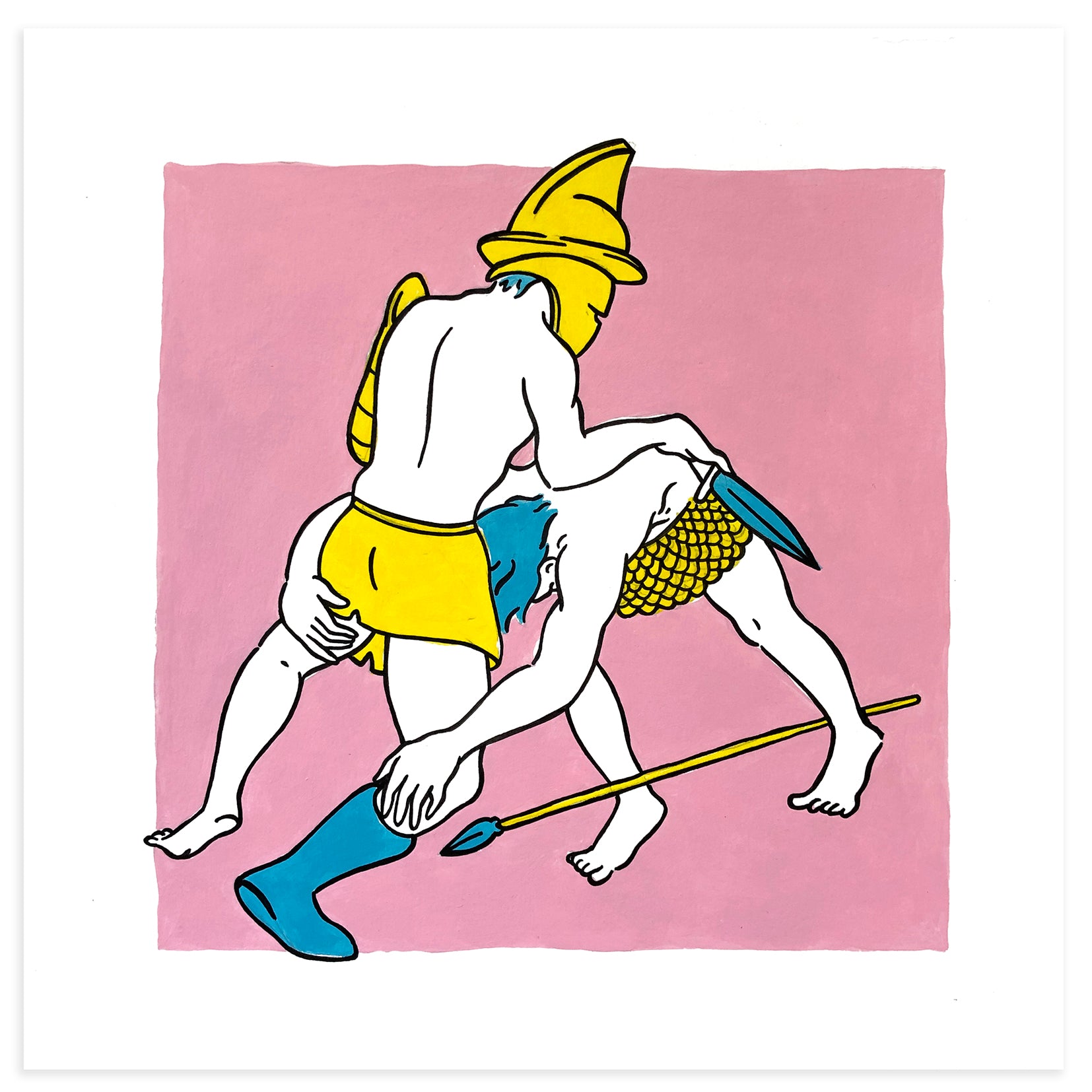 This artwork belongs to the exhibition Rome, a set of artworks where violence, pain and death are offered in the form of a spectacle, merge with Sanz i Vila’s cheerful color palette. Ten exclusive and original pieces that represent a creative milestone for the artist, in which movement and strength are channeled through the fight of these gladiators. Sanz i Vila defines it as follows: "Looking at the past helps us to see that everything could have been different, but the solution always comes late".