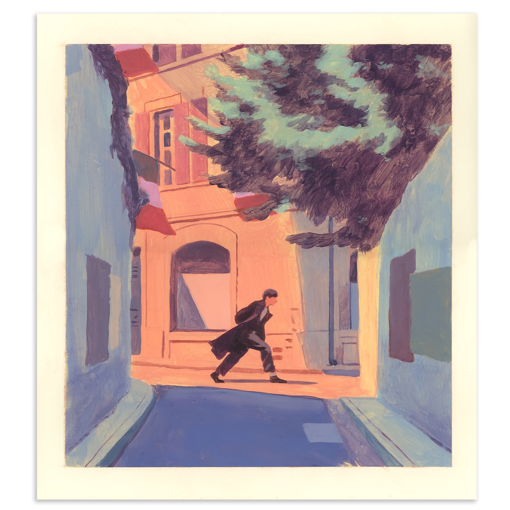 This is an artwork that David de las Heras created for the book ‘Les Grandes Paitres étranges’ by Guillaume Sire. A piece in which the artist recovers his skill when it comes to creating disturbing, masterful and symbolically charged scenes: a street in Paris, it’s windy and a man in a trench coat is crossing the pavement quickly… where is he going?