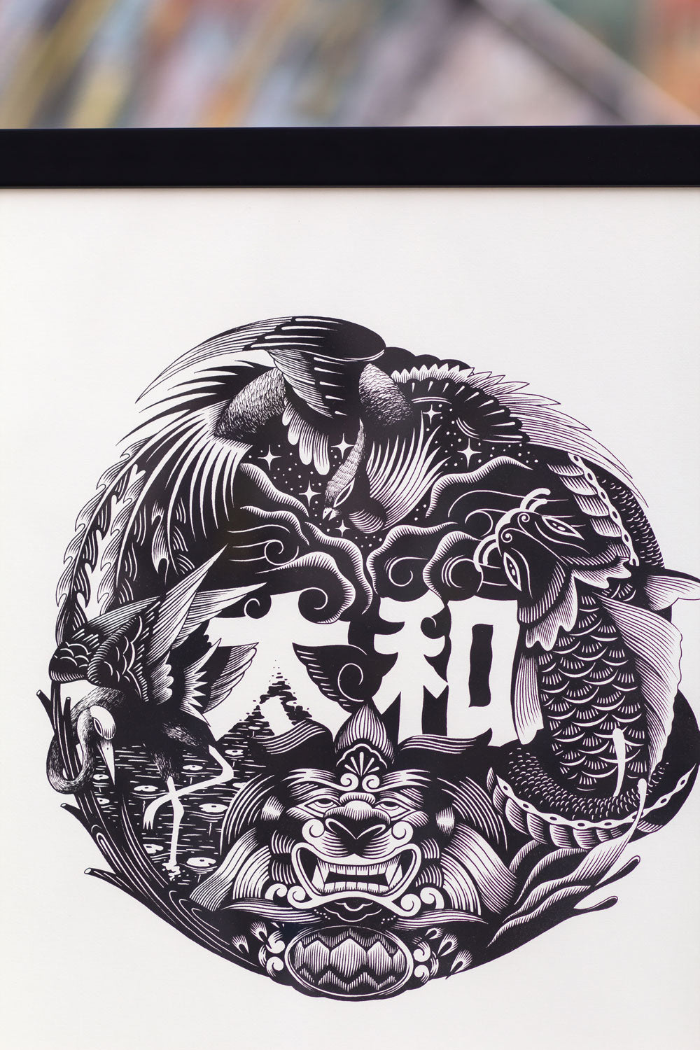 Supreme Harmony. This artwork is a reproduction of a mural that BoaMistura made in Nantou, the old walled city of Shenzhen (China) in winter of 2017. Inspired by a small book of Chinese tales, they came across a beautiful and inspiring story: Judge Eyes without time. Water, wood, air, fire and earth are the Five Pillars of the Cosmos. All of them must speak with one voice. The voice of fire is wood’s voice that feeds it, and water’s voice that extinguishes it, and air’s voice that fuels it, and earth’s voice that sustains it. ”The five elements held hands and concluded with a single voice that sounded to crackle. From embers, to the murmur of fountains, to the sound of forests, to the moan of breezes and the majesty of mountains: - How can it be a representative of heaven who constantly breaks the harmony of the Universe? - There is no thing more sacred than balance. On it depends concord and life”. Lion protects houses and drives away evil spirits. Crane represents longevity and immortality, fish abundance, tree of life and the Phoenix, essence of fire, the balance between the opposing forces. Each of them embodies a Principle; the earth, the air, the water, the wood and the fire, the Five Pillars of the cosmos.